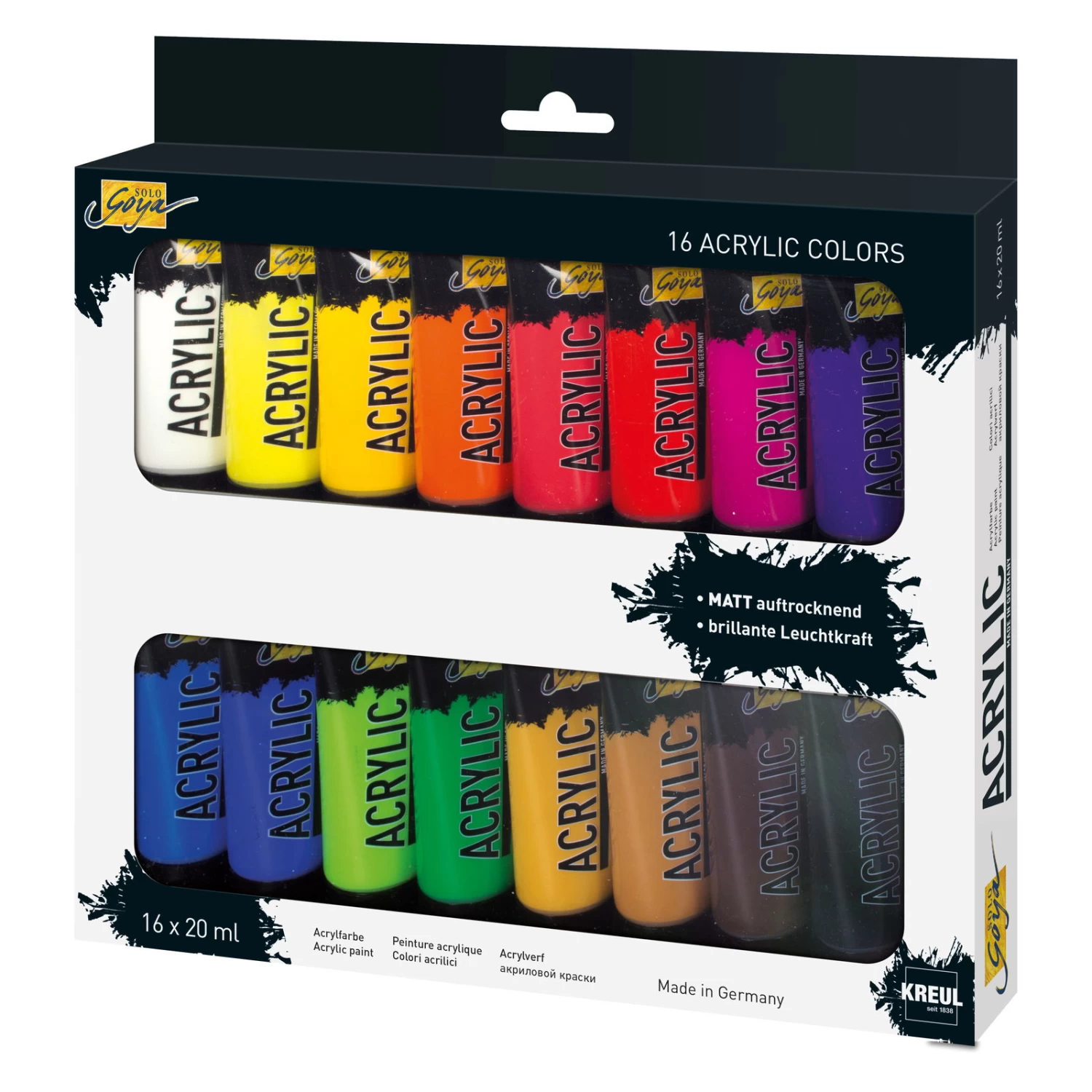 In diesem Acrylfarben-Set erhalten Sie 16 verschiedene Farben mit je 20 ml Inhalt.