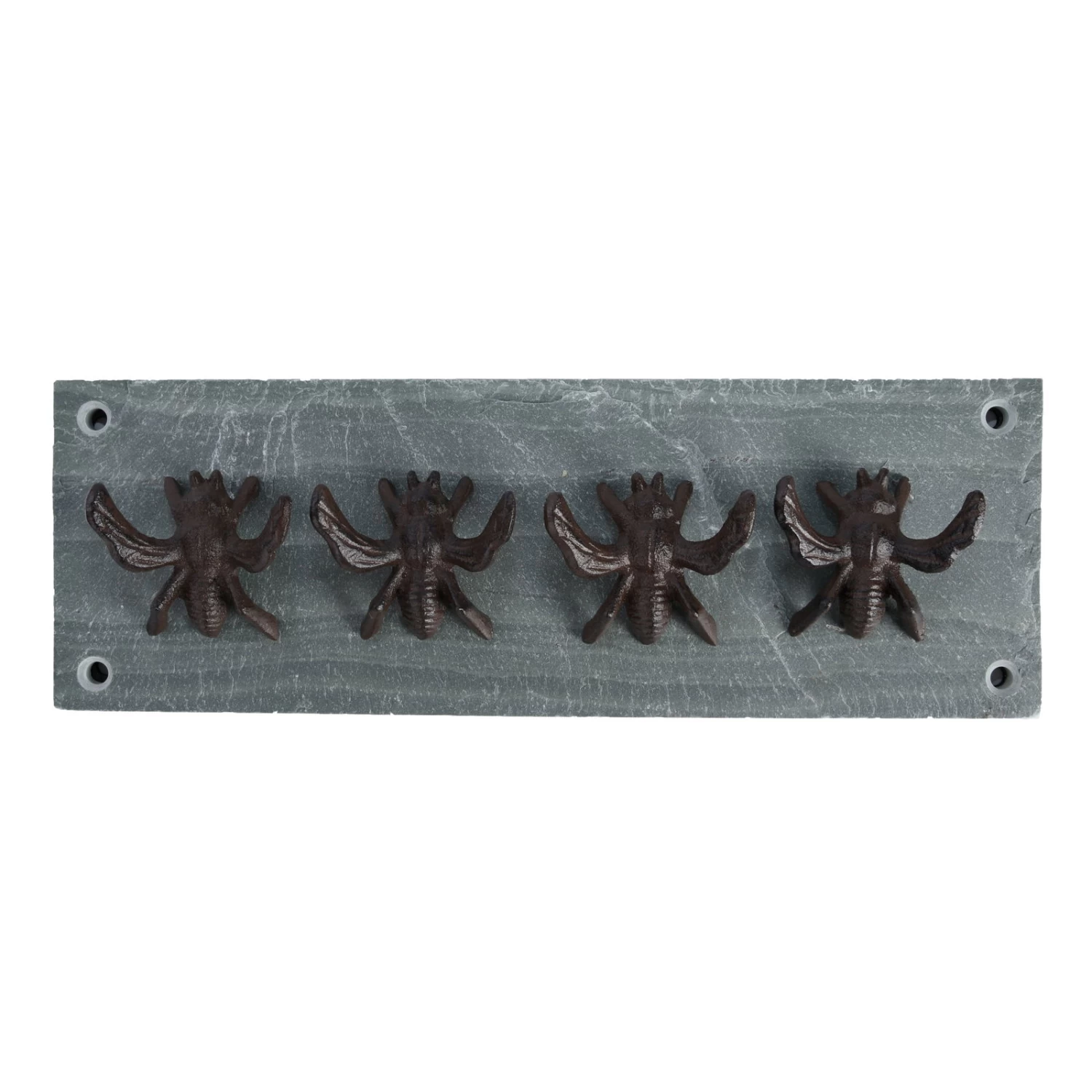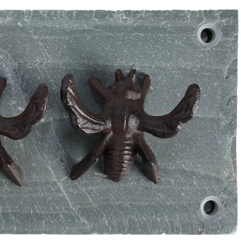 Zum Aufhängen von Gartenwerkzeug oder als eine kompakte Garderobe macht diese praktische Hakenleiste auf Schieferplatte eine gleichermaßen hervorragende Figur. Der Hänger ist mit vier robusten Haken aus Gusseisen in sympathischem Bienenlook bestückt. An der Rückseite befinden sich vier Befestigungslöcher, sodass die Leiste leicht zu montieren ist.