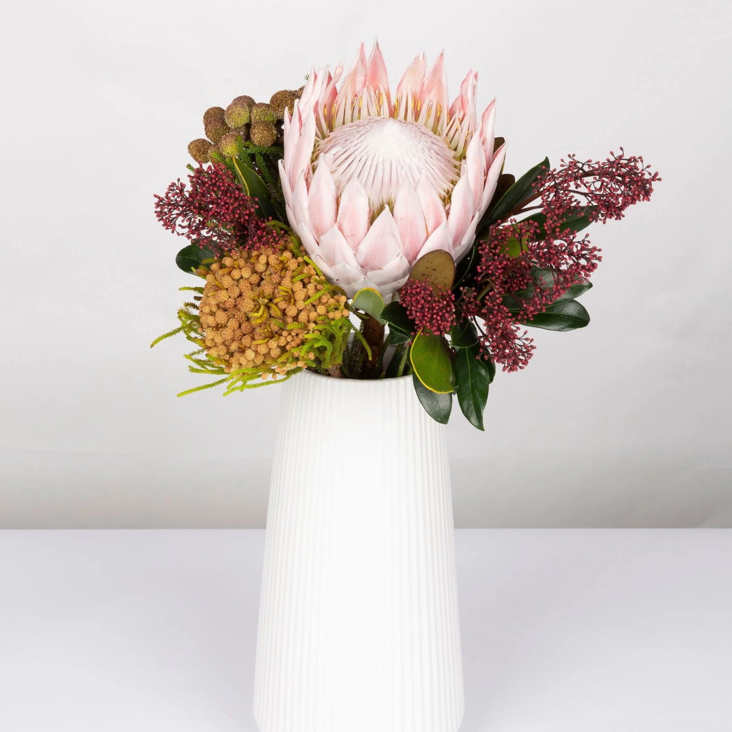 Das DIY-Bund besteht aus einer imposanten Königsprotea, die von Skimmie und verschiedenen Sorten Kapgrün begleitet wird. Unsere Schnittblumen werden im Karton liegend mit einem wasserspeichernden Umschlag im unteren Stielbereich geliefert, so dass sie den Transport unbeschadet überstehen. Egal ob als Strauß oder Gesteck – Vor dem Verarbeiten die Stiele frisch anschneiden und mit frischem Wasser, in das Sie vorher das beigefügte Blumenfrisch gegeben haben, versorgen. Dann steht Ihrer Kreativität nichts mehr im Wege!