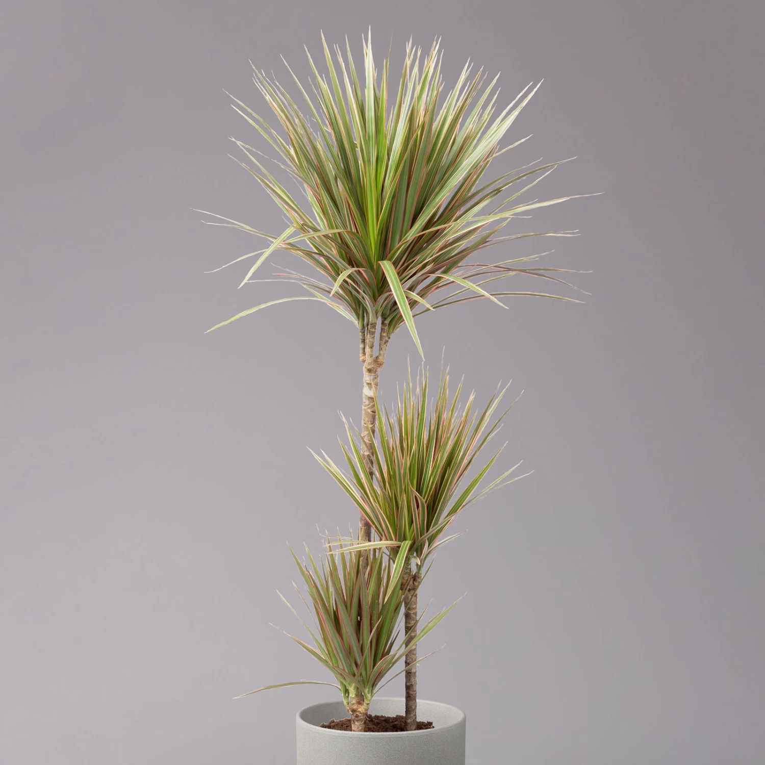 Die schmalen, lanzettlichen Blätter dieses Drachenbaumes tragen eine effektvolle Streifenzeichnung in Rot, Grün und Weiß. Die Dracaena marginata ‚Bicolor‘ erhalten Sie in einem liebevoll gestalteten 3er-Tuff mit unterschiedlich hohen Stämmen. Diese Zimmerpflanze lässt sich in einem Büro, Wohnzimmer oder in einer Küche gekonnt in Szene setzen, ob als exotisches Highlight oder als stimmiges Element Ihres tropischen Begrünungskonzepts. In einem Raum mit Dracaena profitieren Sie von der verbesserten Luftqualität, da die Drachenbäume mehrere Schadstoffe binden. Vorteilhaft sind außerdem die geringen Ansprüche der Dracaena ‚Bicolor‘ an die Pflege, denn dieses Spargelgewächs verzeiht Ihnen gerne ein paar Anfängerfehler. Wenn Sie für Ihren Drachenbaum einen hellen oder halbschattigen Standort aussuchen, die Pflanze nur in beheizbaren Räumen pflegen sowie sich beim Gießen sparsam zeigen, bedankt sich die Dracaena mit einem formschönen Wuchs und mit langer Lebensdauer.