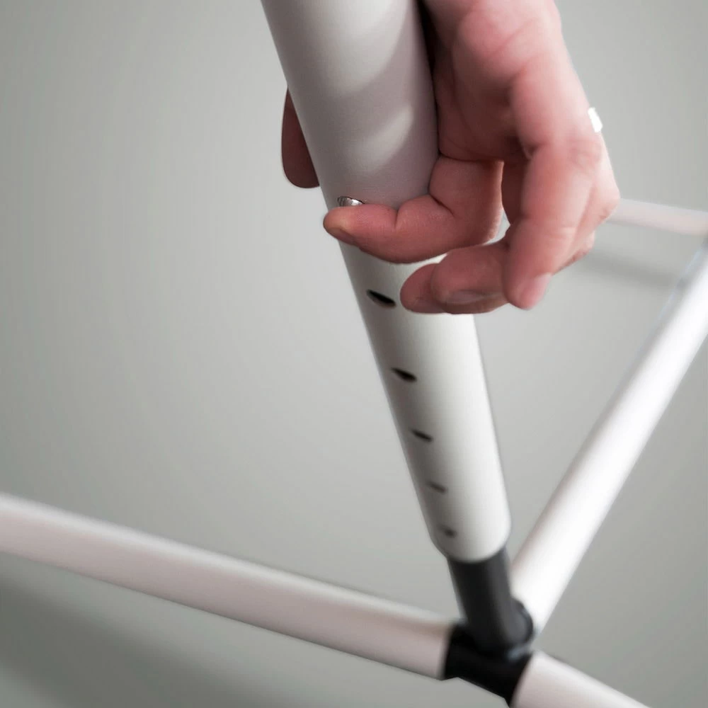 Das Gestell besteht aus pulverbeschichtetem Stahl, ist höhenverstellbar und bis zu 120 kg belastbar.