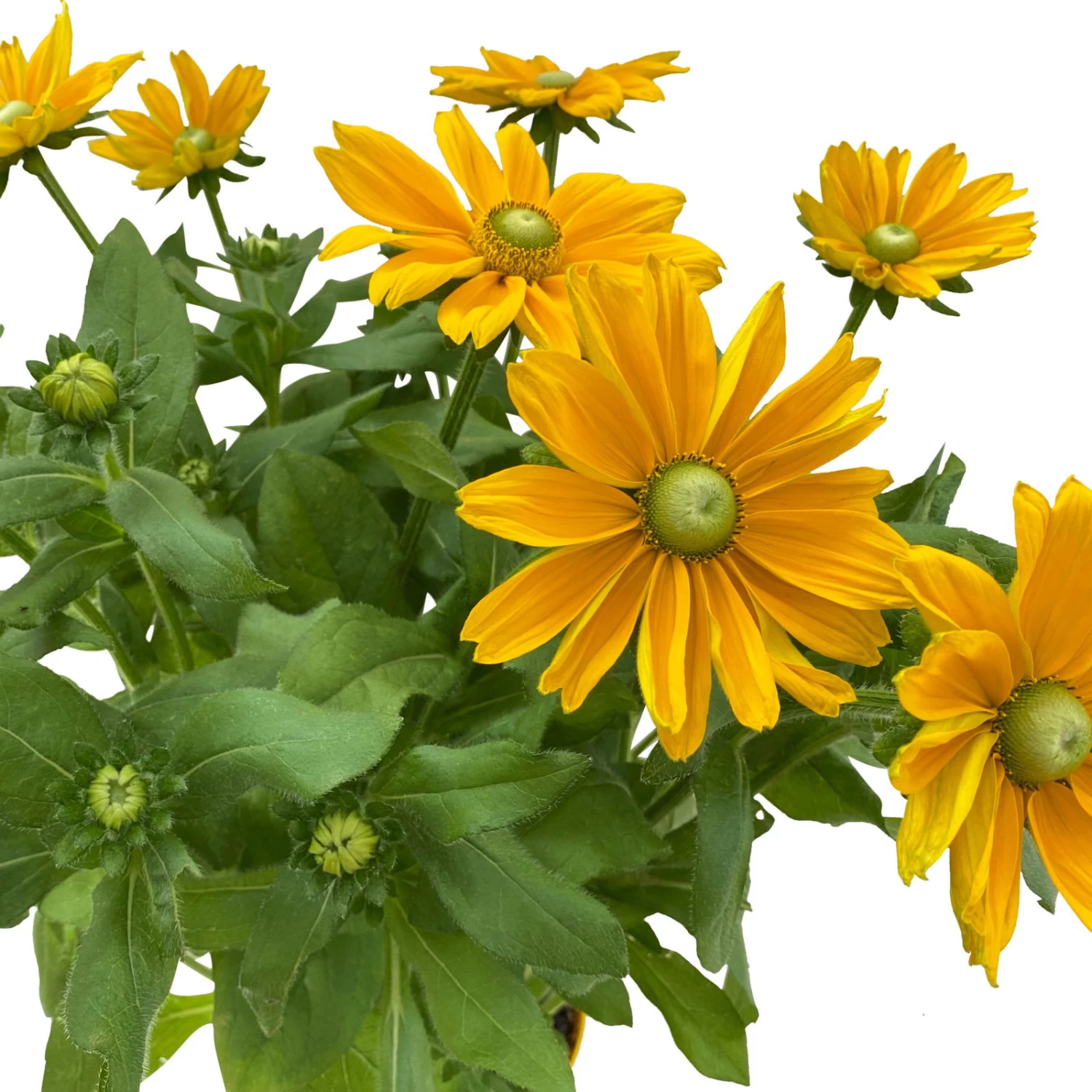 Die Blüte hat häufig ein braunes Blütenkorbchen in der Mitte und ist von den Blütenblättern umgeben. Es gibt auch Sorten, bei denen auch in der Mitte viele Blätter vorhanden sind und das Körbchen kaum oder gar nicht ausgebildet ist. Es gibt den Sonnenhut mit gefüllten oder ungefüllten Blüten. Die Farbe reichen je nach Sorte von Gelb über Orange bis hin zu Rot und setzten sommerliche Akzente in Ihrem Zuhause. Die Sorte wird nach Verfügbarkeit geliefert.